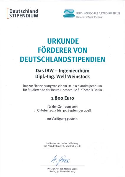 Das Büro unterstützt im Förderzeitraum 01.10.2017 bis 30.09.2018 einen Stipendiaten der Fachrichtung Versorgungstechnik an der Beuth-Hochschule mit einem Deutschlandstipendium.